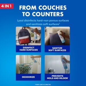 - DISINFECTING AND SANITIZING SPRAY: Lysol disinfects hard non-porous contact surfaces and sanitizes soft surfaces. This multipurpose spray can be used in the home and kitchen, to disinfect toys, couches, counters(3), bathrooms, and over 100 more surfaces.