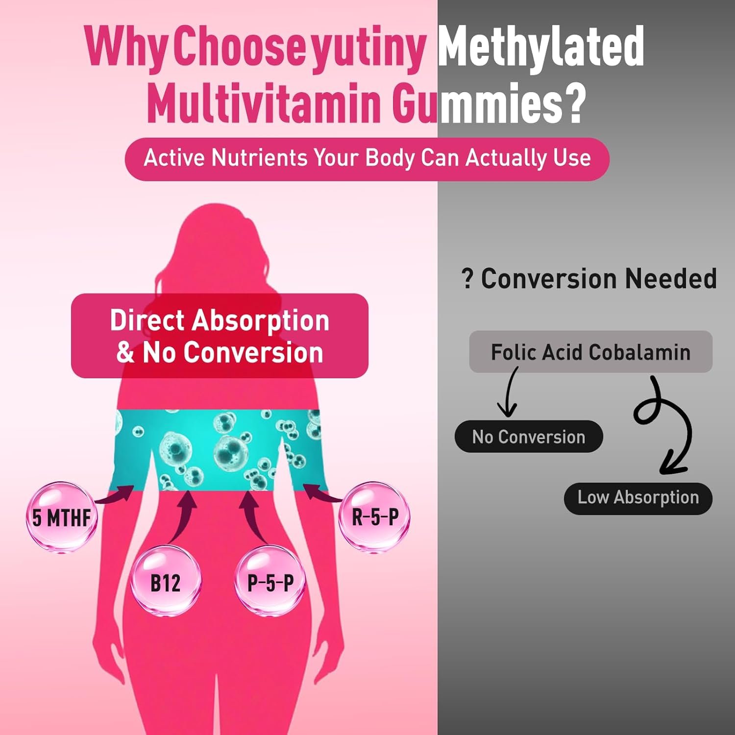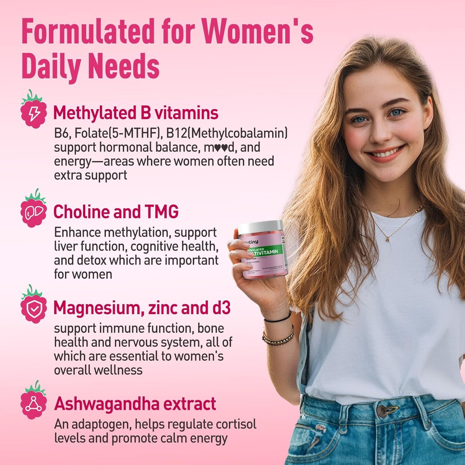 Methylated Multivitamin for Women Gummies, Methyl B Complex Vitamins with D3 Zinc Choline TMG for Energy & Nervous System, Vegan, Sugar Free, 60 Count